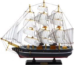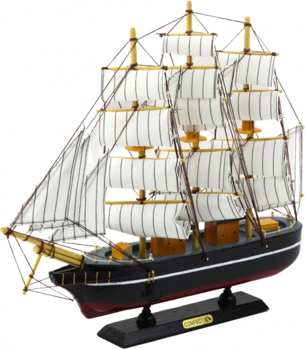 Historyczny trójmasztowiec to replika w stylu dekoracyjnym, którą pokochają wszyscy miłośnicy historii marynarki. Jego czarny kadłub z subtelnymi detalami, białe tekstylne żagle oraz cała konstrukcja oferują elegancję i ponadczasowość, które dopełnią każdy wystrój – salon, gabinet czy gablotę kolekcjonerską.