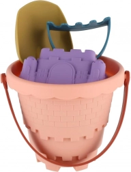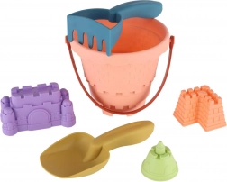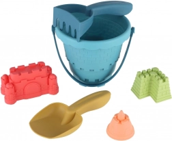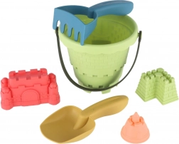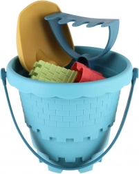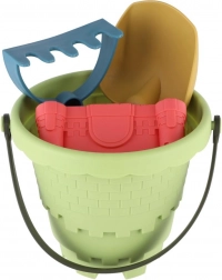 Wiaderko, łopatka, grabki i trzy foremki do kreatywnego budowania i formowania piasku w jednym lekkim zestawie.