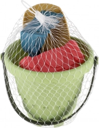 Plastowy zestaw do piasku z wiaderkiem, łopatką, grabkami i 3 foremkami w siateczce