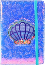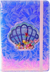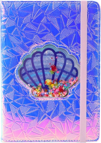 Środek okładki zdobi transparentna muszla wypełniona konfetti w kształcie kwiatków i serduszek, które swobodnie przesuwają się przy każdym ruchu. Całość dopełnia elastyczna gumka w kontrastowym kolorze, która utrzymuje notes zamknięty i chroni strony przed zagięciem lub przypadkowym otwarciem.