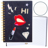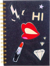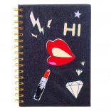 Ten elegancki notatnik o oryginalnym i nowoczesnym wyglądzie łączy ciemne, błyszczące wykończenie z pop-artową grafiką, taką jak usta, diamenty, błyskawice i szminki.