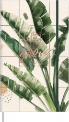 Delektuj się elegancją notatnika z twardą, matową okładką, zdobioną realistycznym motywem dużych, zielonych liści na jasnym tle. Centralnie umieszczony napis „Let life grow” dodaje pozytywnej energii i subtelnego uroku.