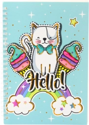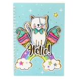 Kolorowy i wesoły notes z motywem bajkowego kotka-jednorożca jest idealny dla dzieci, które kochają fantazyjną grafikę i pastelowe barwy. Okładkę zdobi przyjazny kotek z kokardką i rogiem jednorożca, siedzący na wielobarwnej tęczy w otoczeniu chmurek, lodów i gwiazdek. Notes utrzymany jest w delikatnym turkusowym odcieniu, który dodaje świeżości i pozytywnej energii.
