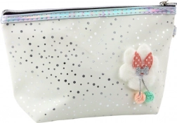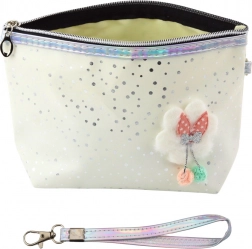 Kosmetyczka jest wyposażona w niezawodny zamek oraz wygodny uchwyt z karabińczykiem, co umożliwia łatwe przypięcie do plecaka lub noszenie na nadgarstku. Ozdobiona jedwabną kokardką i pomponem, które dodają uroku, a powierzchnia pokryta brokatem pięknie mieni się w świetle, tworząc atrakcyjny i nowoczesny wygląd.