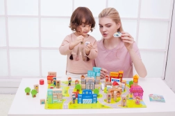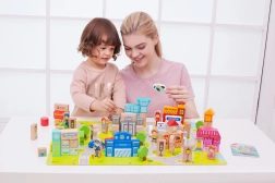 Dzięki temu zestawowi dzieci mogą budować typowe budynki miejskie, takie jak szkoła, posterunek policji, remiza strażacka, lotnisko, szpital, bank, restauracja, sklep zoologiczny i inne. Zabawka jest wykonana z naturalnych, biodegradowalnych i hipoalergicznych materiałów, co zapewnia maksymalne bezpieczeństwo.