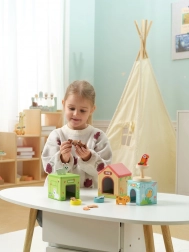 Ten wesoły zestaw uczy dzieci, jak żyją zwierzątka i jak właściwie się nimi opiekować. Dzięki kolorowym drewnianym elementom, wykonanym z drewna certyfikowanego FSC, dzieci rozwijają motorykę oraz koordynację ręka–oko.