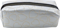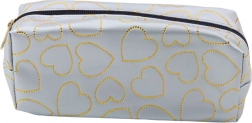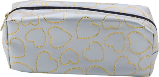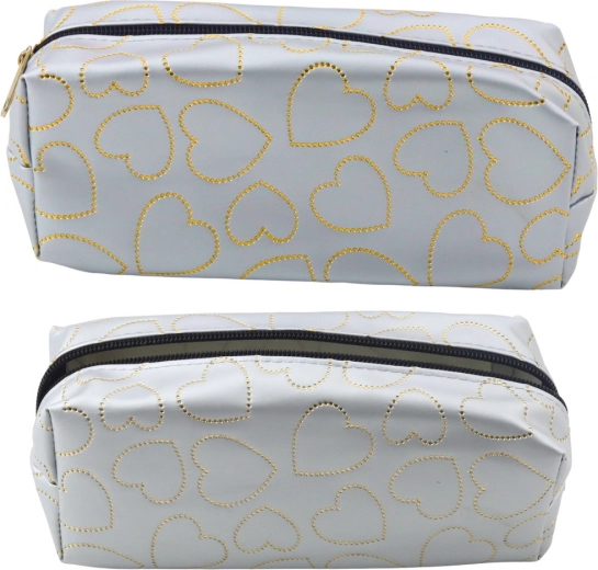 Stylowy i funkcjonalny piórnik w eleganckim srebrnym kolorze z wzorem złotych serc, idealny dla studentów i każdego, kto ceni praktyczne i modne akcesoria.