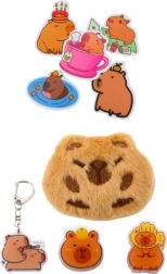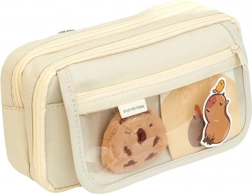 Piórnik wykonany jest z wytrzymałego materiału, który zapewnia długą żywotność. Jego elegancki beżowy kolor pasuje do różnych stylów. Zawiera również pluszową kapibarę, którą można przypiąć do piórnika, plecaka lub ubrania. Zestaw akcesoriów obejmuje także brelok z motywem kapibary, dwa klipsy oraz pięć naklejek z kapibarą.
