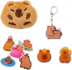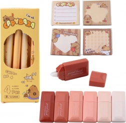 Zestaw zawiera bogaty komplet dodatków z motywem kapibary, w tym: 4 długopisy z czarnym tuszem, 6 myszek-korektorów, 4 komplety dekoracyjnych karteczek samoprzylepnych, pluszową kapibarę z broszką, brelok z kapibarą, 2 spinki z kapibarą oraz 5 zabawnych naklejek. Produkt jest idealnym prezentem dla uczniów, miłośników zwierząt lub każdego, kto kocha unikalne dodatki do nauki.