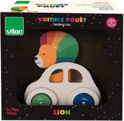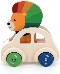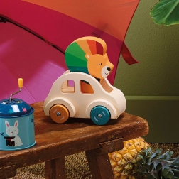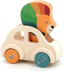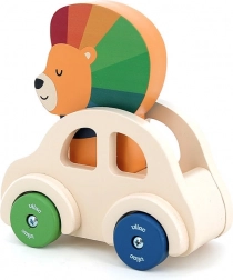 To urocze drewniane autko jest idealną zabawką dla małych dzieci. W jego środku siedzi mały lew z kolorową grzywą, a na jego głowie umieszczony jest klakson, który dzwoni przy naciśnięciu. To pobudza interakcję i wzbudza zainteresowanie odkrywaniem.