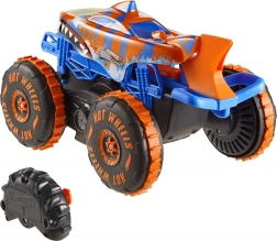 Duże, głęboko bieżnikowane koła z napisem HOT WHEELS trzymają się toru na dywanie, ziemi i betonie, radząc sobie z bardziej wymagającym terenem bez utraty stabilności.