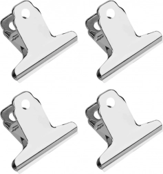 Klipsy wykonane są z wytrzymałego metalu, co gwarantuje ich trwałość i możliwość wielokrotnego użycia. Prosty kształt oraz błyszcząca, chromowana powierzchnia nadają im profesjonalny wygląd. Dzięki otworowi w uchwycie klipsy można łatwo zawiesić na tablicy lub haczyku.