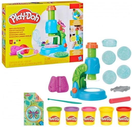 Zestaw do zabawy Play-Doh Mikroskop został zaprojektowany, aby wspierać ciekawość i kreatywność dzieci. Świecący mikroskop nadaje masie plastycznej efekt blasku: wystarczy wypełnić przezroczyste szkiełka masą i nacisnąć mikroskop w dół.
