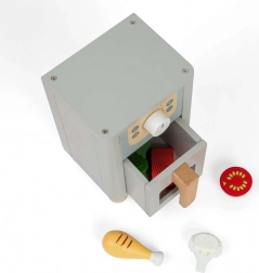 Drewniana frytkownica beztłuszczowa od Bigjigs Toys pozwala najmłodszym doświadczyć radości z gotowania. Wyposażona jest w obrotowe pokrętło do wyboru temperatury, szufladę na akcesoria oraz pięć drewnianych produktów spożywczych. Doskonale wspiera rozwój małej motoryki i kreatywności.