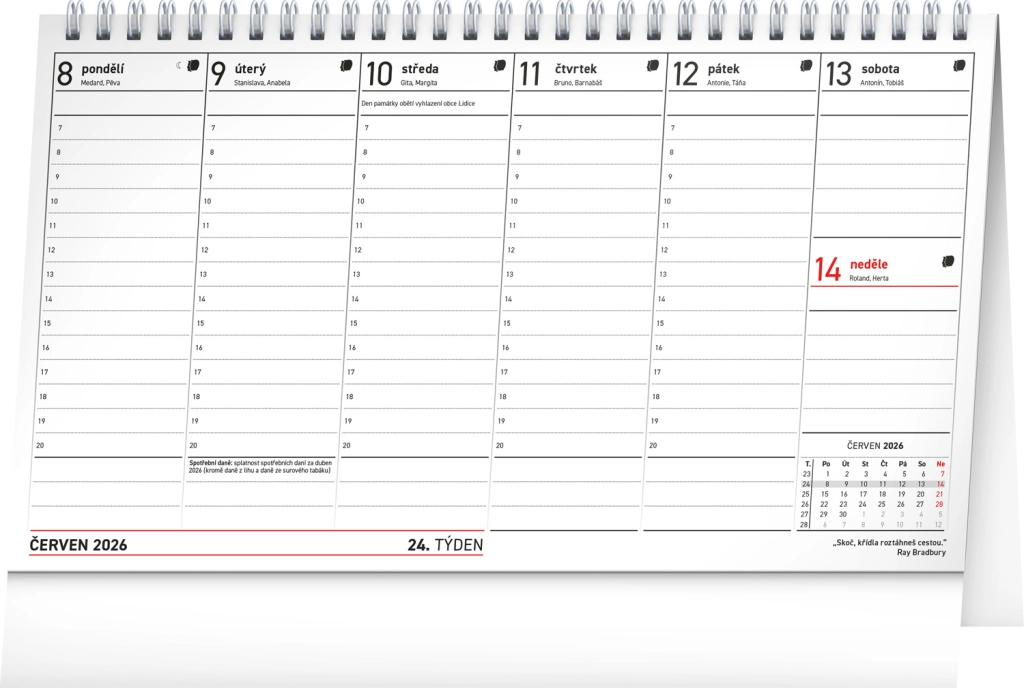 - Kalendarium kolumnowe z miesięcznym przeglądem w każdym tygodniu.