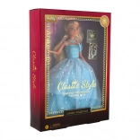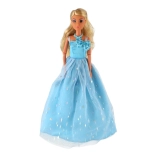 Długa, jasnoniebieska suknia z delikatnym połyskiem i kwiatowymi zdobieniami przemienia lalkę w królową każdej wyimaginowanej uroczystości.