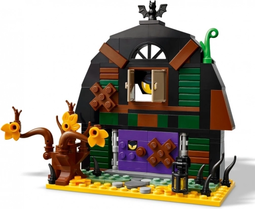 Zbuduj skrzypiącą stodołę z mrocznymi ścianami, fioletowymi drzwiami i nietoperzem na dachu. Wewnątrz odkryjesz mnóstwo niespodzianek – od ukrytych „zębów” za drzwiami, przez zdobione oko, po zieloną buteleczkę i czarne naczynie. W zestawie znajduje się też drzewo i latarnia, które dopełniają tajemniczą atmosferę.