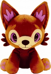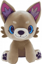 Brązowa pluszowa zabawka z fioletowymi oczami i uśmiechniętą buzią. Idealna do zabawy i przytulania dla dzieci.