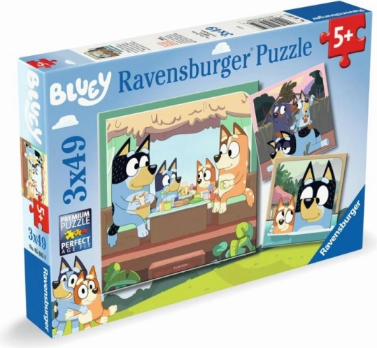 Puzzle Bluey 3x49 elementów dostarczają zabawy z motywem serialu. Wysoka jakość i precyzyjne elementy od Ravensburger dla świetnego układania.