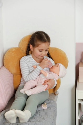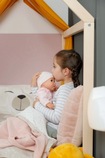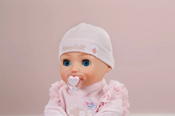 Annabell o wysokości 43 cm ma miękkie ciałko idealne do przytulania i delikatnej zabawy. Interaktywna technologia zapewnia naturalne reakcje – podczas ssania smoczka lub picia z butelki porusza ustami i w zależności od sytuacji zamyka lub otwiera oczy. Dzięki kojącemu kołysaniu łatwo ukołyszesz ją do snu w dwóch kierunkach.