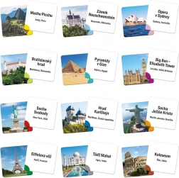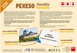Pexeso Zabytki zapewnia tradycyjną zabawę w szukaniu par, gdzie gracze muszą znaleźć fotografię zabytku i jego odpowiadającą nazwę. Wszystkie nazwy są w języku czeskim i gra wspiera rozwój pamięci, myślenie logiczne i delikatną motorykę. Gra jest łatwo dostępna również dla starszych graczy i małych dzieci, dzięki kolorowym rogom kart, które ułatwiają szukanie. Główne cechy: