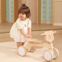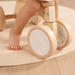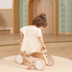 Pierwsze kroki w świecie jazdy dzieci opanują z pewnością dzięki stabilnej czterokołowej konstrukcji i wygodnemu siodełku z oparciem przeciw zsuwaniu. Jeździk wykonano z wysokiej jakości drewna i wyposażono w ciche kółka EVA, które są delikatne dla podłóg i dobrze radzą sobie także na gładkich powierzchniach zewnętrznych.