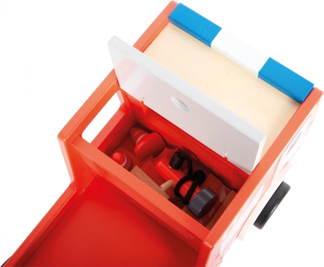 Drewniany wóz strażacki Small Foot z wysuwaną drabiną, magnesami i dodatkami dla realistycznej zabawy. Odpowiedni dla dzieci 3+.