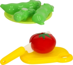 Ten bogaty zestaw pozwala dzieciom przygotowywać „posiłki” z kolorowych owoców i warzyw podzielonych na części, które łączą się za pomocą rzepu. Zabawa nożykami i akcesoriami pomaga w prawidłowym chwycie, koordynacji oko–ręka oraz w naturalny sposób zapoznaje z nazwami produktów.
