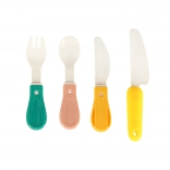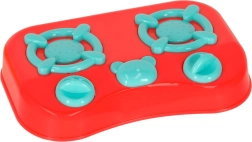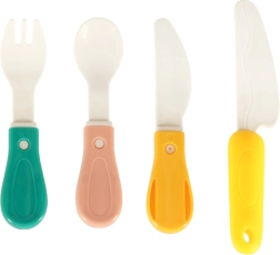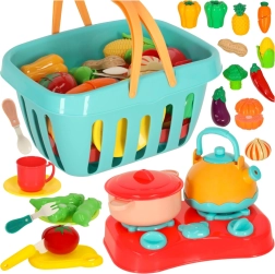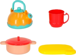 - Akcesoria kuchenne (15 szt.): czajniczek, garnek z pokrywką, sztućce (duży i mały nóż, łyżeczka, widelec), kubek, deska do krojenia, dziecięca kuchenka/palnik, koszyczek.
