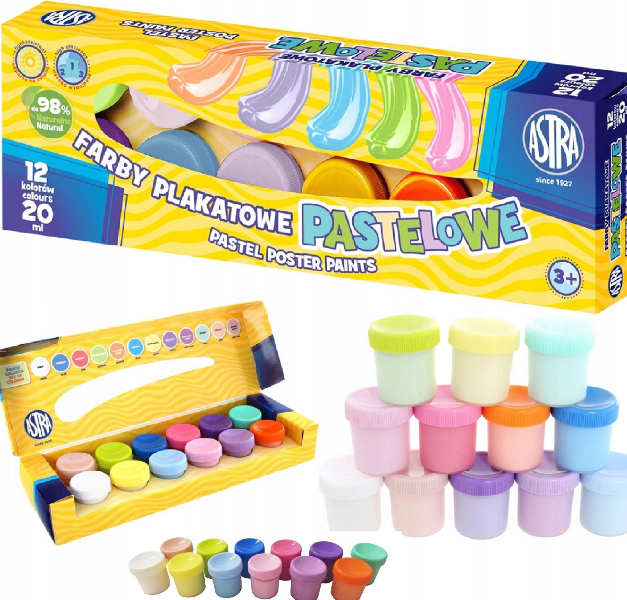 Odkryj urok subtelnych pastelowych tonów z zestawem farb temperowych ASTRA. Zestaw 12 odcieni po 20 ml jest świetny dla dzieci i hobbystów – łatwo się nakłada, miesza i czyści, a przy tym oferuje wysokie krycie dzięki wysokiej jakości drobno mielonym pigmentom.