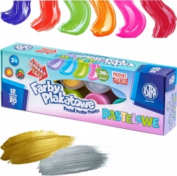 Zestaw pastelowych farb temperowych ASTRA oferuje 12 delikatnych odcieni po 20 ml, w tym 2 metaliczne tony. Farby są rozcieńczalne wodą, mają wysoką siłę krycia, po wyschnięciu dają matowe wykończenie i cechują się odpornością na światło – idealne do szkolnego i domowego tworzenia.