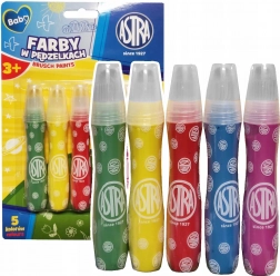 Idealny zestaw dla małych artystów: ASTRA farby w pędzlach, 5 szt. Każdy pędzel już zawiera farbę, więc nie są potrzebne dodatkowe akcesoria. Łatwe użycie przez naciśnięcie, bezpieczny skład i projekt dla dzieci od 3 lat – świetne na papier i karton.