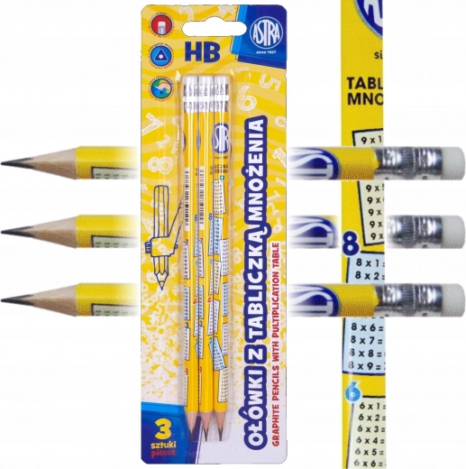 Szkolne ołówki ASTRA z nadrukiem tabliczki mnożenia to świetny wybór dla uczniów i do codziennego pisania. Trójkątny kształt wspiera prawidłowy chwyt, grafit HB zapewnia płynne pisanie, a zintegrowana gumka umożliwia szybkie poprawki. Nadruk tabliczki mnożenia pomaga w ćwiczeniu w dowolnym miejscu i czasie.
