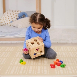 Ta drewniana, otwierana kostka oferuje klasyczną zabawę w rozpoznawanie kształtów. Dzieci wkładają poszczególne elementy w odpowiednie otwory, ćwicząc koordynację ręka–oko, logiczne myślenie i koncentrację. Dzięki żywym kolorom nauka staje się naturalnie przyjemna.
