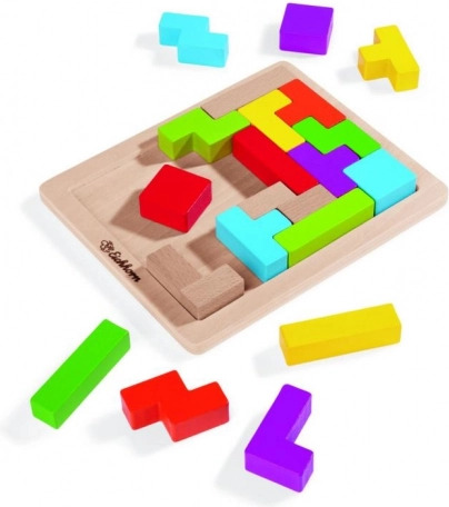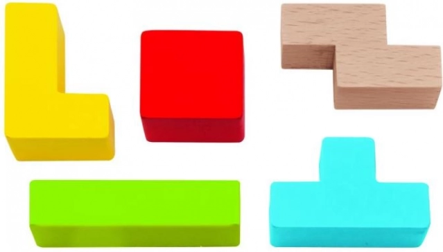 Pomysłowa drewniana układanka dla 1 gracza wspiera rozwój motoryki małej i logicznego myślenia. Zawiera 20 kolorowych klocków z drewna bukowego w 5 różnych kształtach oraz solidną płytę ze sklejki o wymiarach 18 × 15 cm do precyzyjnego układania kształtów.
