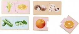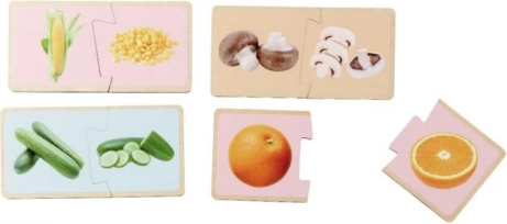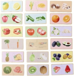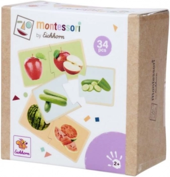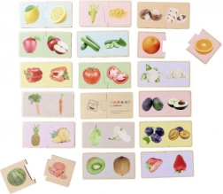Drewniane puzzle Montessori z motywem owoców i warzyw uczą dzieci prawidłowego łączenia pasujących elementów i nazywania poszczególnych produktów. Realistyczne ilustracje pomagają powiązać zabawę z codziennym życiem i wspierają naturalną naukę poprzez zabawę.