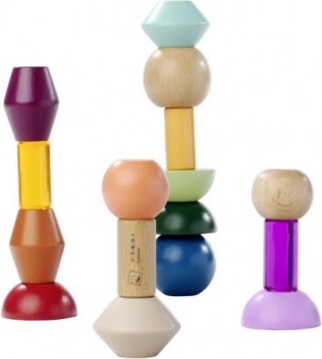 Te wyjątkowe geometryczne klocki wymagają odrobiny zręczności i świetnie motywują do koncentracji. Z kolorowych elementów dzieci poznają i układają 5 nowych kształtów, a przezroczyste akrylowe cegiełki dodają konstrukcjom ciekawy kontrast.