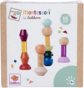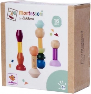 Montessori klocki do układania otwierają dzieciom świat kształtów i kreatywności: z 16 elementów łatwo zbudują wieże i wzory. Połączenie drewna FSC, 5 kształtów geometrycznych i 2 akrylowych cegiełek zachwyci małych budowniczych; odpowiednie od 3 lat.