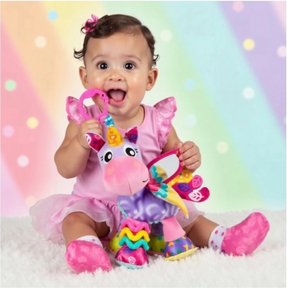 Uroczy jednorożec Stella od Playgro to mięciutka zawieszka dla najmłodszych, która wspiera rozwój zmysłów i bawi zarówno w podróży, jak i w domu. Oferuje lusterko do samopoznania, szeleszczące i brzęczące elementy, różne faktury i kontrastowe wzory stymulujące wzrok, dotyk i słuch. Dzięki praktycznemu klipsowi C łatwo przymocujesz ją do wózka, fotelika samochodowego lub łóżeczka.