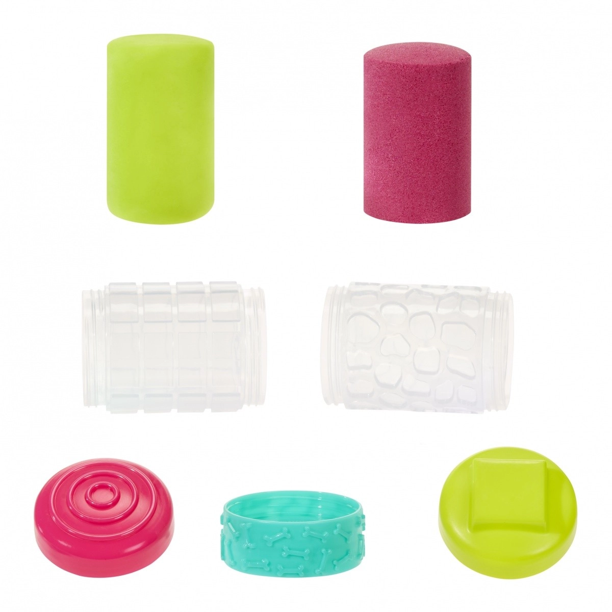 1 tubus piasku, 1 tubus masy, 2 wieczka ze stemplami, 1 łącznik/wałeczek z teksturami