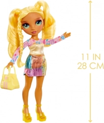 Sunny z RAINBOW HIGH to pewna siebie ikona mody, która inspiruje dzieci do wyrażania własnej indywidualności. Jej strój łączy intensywnie żółte i tęczowe akcenty – wyrazisty top, ponadczasową spódnicę, eleganckie czółenka i torebkę w dopasowanym odcieniu. Włosy upięte w figlarne kucyki zachęcają do kreatywnego czesania.