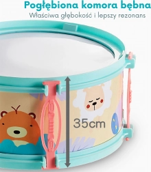 Ten dziecięcy zestaw perkusyjny to świetny start muzycznej przygody. Zapewnia bogate efekty dźwiękowe, stabilną konstrukcję oraz praktyczny uchwyt na telefon lub tablet do gry z podkładem muzycznym. Dzięki kompaktowym wymiarom pasuje do pokoju dziecięcego i łatwo go czyścić wilgotną ściereczką.