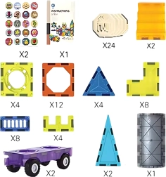 - 4× kwadrat z otworami, 12× ośmiokąt, 4× trójkąt, 8× element w kształcie L, 24× karty z naklejkami/obrazkami, 2× podłużny prostokąt („cegła”), 8× kwadrat z kratką, 4× trójkąt z półkolem (schodki), 2× podwozie z kołami, 2× wysoki trójkąt (wieża), 1× walec (dach), 2× arkusz naklejek, 1× instrukcja/przewodnik STEAM