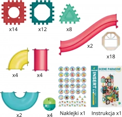 - Magnetyczne płytki, rynny, zakręty, rurki, kulki, ilustrowane instrukcje