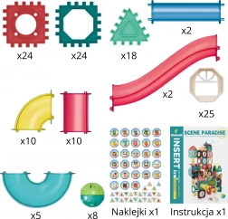 Duży zestaw 128 elementów oferuje szeroką gamę kształtów i kolorów do tworzenia prostych i zaawansowanych projektów. Przezroczyste części umożliwiają śledzenie ruchu kulek i w naturalny sposób wyjaśniają prawa prędkości, grawitacji i bezwładności. Zabawa rozwija kreatywność, cierpliwość oraz umiejętności techniczne.
