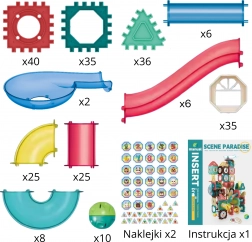 - Magnetyczne płytki, elementy toru (rynny, zakręty, rurki), kulki, instrukcja/inspiracje