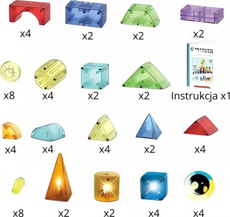 - Różne kształty – kwadraty, trójkąty, prostokąty oraz elementy do budowy kół