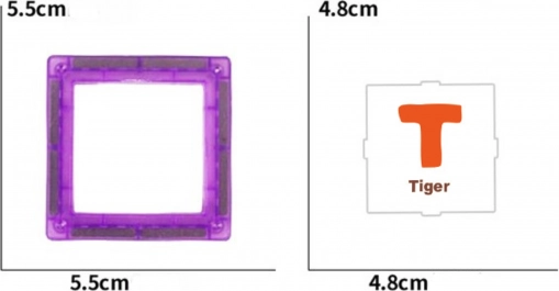 - 8 niebieskich kwadratów, 7 czerwonych kwadratów, 9 szarych kwadratów, 7 fioletowych kwadratów, 9 zielonych kwadratów, 30 edukacyjnych kart z literami