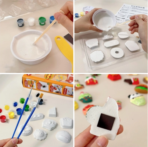 - Kompletne opakowanie – formy, gips, farby, pędzle i narzędzia, w tym miska do mieszania.