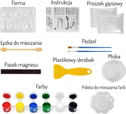 - Wszystko w zestawie: formy, gips, miseczka, łyżeczka, paleta, 6 farb, pędzelek, szpatułka, instrukcja